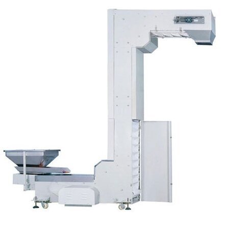 The Z-type bucket elevator reduces material friction and impact structurally for such materials as granulates, blocks, or fragile materials such as food particles, plastic particles, and chemical crystals.